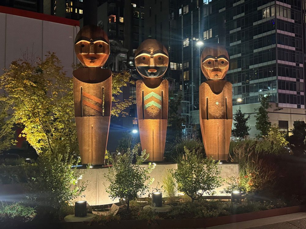 Peterson carved the bodies and heads separately and joined them to make sculptures that stand between 10 and 12 feet tall, not including their bases. They have textured, incised, and painted details, with each figure displaying variations of a streamlined form that unifies the trio. The artwork amalgamates older carving traditions and contemporary vision. Assisting Peterson was Adam McIsaacs, who has collaborated with many Native artists throughout Washington state. Together, they shaped the wood, giving each figure distinctive features, while maintaining a consistent sense of scale and gravity.